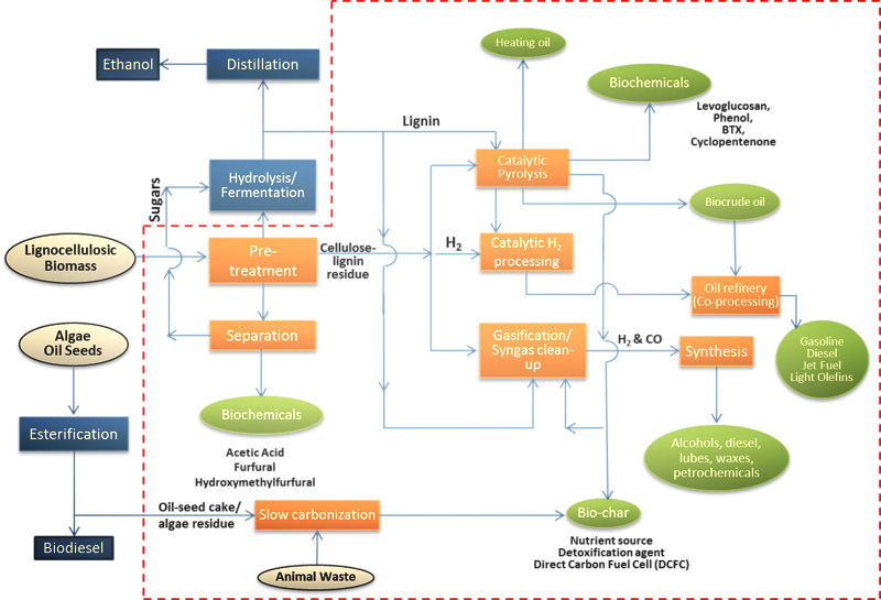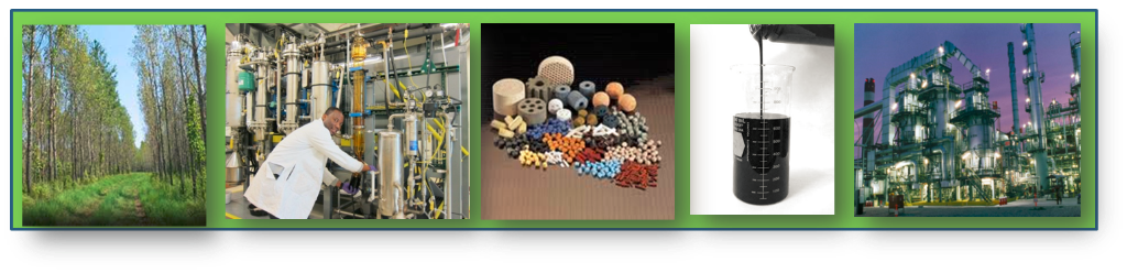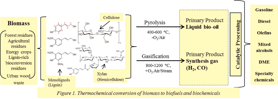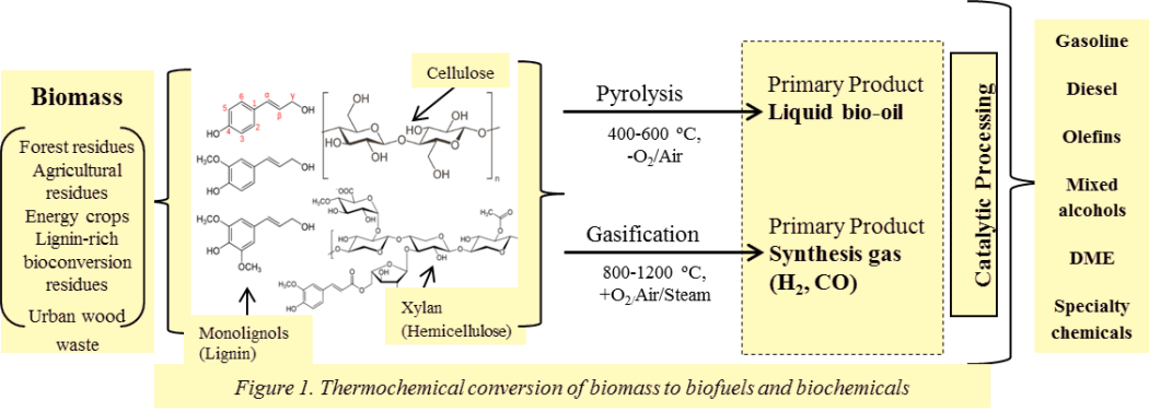 Concerns over climate change and the need to overcome unstable energy markets have spurred interest in the development of efficient, economic, and sustainable technologies for the production of alternative fuels, chemicals, and power. Currently, biomass is one of the major alternative sources of renewable carbon that can readily be used to partially displace petroleum derived fuels and chemicals. To date, several biochemical and thermochemical platforms are being developed to convert biomass into advanced biofuels and bioproducts. Nevertheless, commercial options for biofuels are limited to bio-ethanol from grains and sugarcane. Promising thermochemical pathways as pyrolysis and gasification are yet to be competitive.